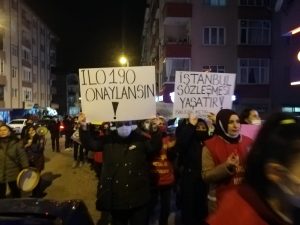 İstanbul Sözleşmesi Yaşatır, Erkek Şiddetine Karşı Örgütlü Feminist Mücadelemizi büyütüyoruz, Biz Kadınlar Kirpiğimiz Yere düşmesin diye omuz omuza mücadeleye devam edeceğiz. ÖZ SAVUNMA HAKTIR, Geceleri de Sokakları da Terk Etmiyoruz,