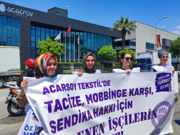 “Acarsoy patronlarına, insanca ücret vermeyenlere, emeğimizi sömürenlere, iş güvenliğimizi yok sayanlara; işyerinde baskıya, ağır mobbinge, cinsel tacize, erkeklerden daha yoğun çalışıp daha düşük ücret almaya, sendika karşıtlığına isyan” diyen kadınlar, hep birlikte “Yaşasın kadın dayanışması”, “Susmuyoruz, korkmuyoruz, itaat etmiyoruz”, “Acarsoy işçisi yalnız değildir” “Dünya yerinden oynar kadınlar özgür olsa”, “Sendika haktır engellenemez” sloganları attı.
