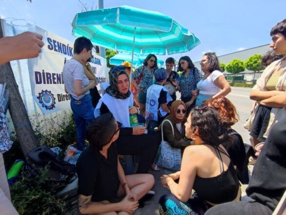 “Biz biliyoruz ki arkadaşlarımızın atılma sebebi işyerindeki direnişleridir, sendikal haklarını kullanmasıdır. Arkadaşlarımız işyerinde sadece emeğinin sömürülmesiyle karşı karşıya değil. Uzun saatler boyunca erkeklerden daha düşük ücretlerle, iş güvenliği olmadan çalışıyorlar. Can güvenlikleri hiçe sayılıyor… Böyle bir kriz ortamında, bu kadar yüksek enflasyon varken, bu kadar yoksulluk varken, biz kiramızı ödeyemiyorken, akşam yapacağımız yemeği nasıl çıkaracağımızı düşünürken… Hem düşük ücrete çalışıp hem de haksız yere işten atılıyorlar. Gölgelerindeki ağaç bile kesildi. Çocukları bile kreşten atıldı. Yani bu kadar gözü dönmüş bir sermaye ile karşı karşıya bu arkadaşlarımız. Biz de Yoksulluğa Feminist İsyan olarak, arkadaşlarımızın direnişini sahipleniyoruz.”