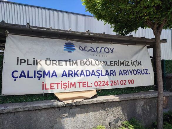 Bu arada, direnişçi kadınların, içerde çalışan işçilerle temasını engellemek için bahçe duvarını yapay çimlerle kapatan Acarsoy yönetimi, fabrikaya koca bir pankart asarak eleman ilanı vermiş.