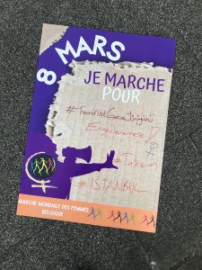Brüksel Merkez İstasyonu (Gare Centrale) önünde gerçekleşen, birçok sendika, sivil toplum örgütü ve kadın örgütünün katıldığı genel grevde cinsiyete dayalı ücret farkının yanı sıra, kadınların iş gücü piyasasına eşit erişimi, artan toplumsal cinsiyet temelli şiddet ve taciz ve Rusya-Ukrayna savaşının yarattığı yıkıma dikkat çekildi.