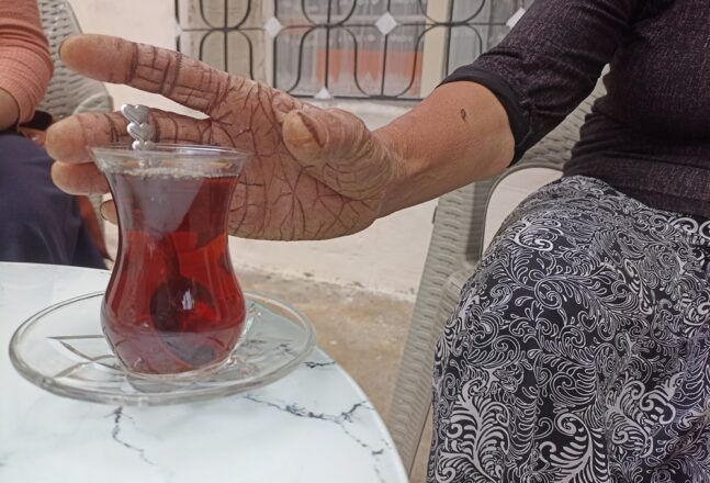 Sohbet ettiğimiz kadınlardan biri olan Makbule, 56 yaşında ve elleri nasırdan paramparça olup beli de tutmayıncaya dek tarlalarda çalışmış. Şimdi evde torunlara bakıyor ve peksimet gibi ev yapımı ürünler yapıp bunları satarak geçiniyor. O da çocuk yaşında başlamış çalışmaya. Erkekler genelde çalışmadığı ya da sürekli çalışmadığı için, Makbule tarlada kazandığı para ile hem ev geçindirmiş hem de çocuklarını büyütmüş. Tarlada çalıştığı yıllarda sara hastalığına yakalanmış. Bayılmaları “ayıp” kabul edip vücudu da direncini yitirince tarla işlerini bırakmış. Şimdi sigortasız ve yine kendi emeğine bağlı bir şekilde yaşıyor. Diğer kadınların konuşmalarını sürekli başıyla onaylıyor. Çok konuşmak istemiyor.