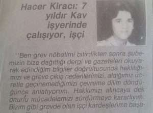 Aynı yılın 1 Haziran tarihli gazetesinde Grev Günlüğü köşesinde bu kez Orhangazi’deki KAV Kibrit fabrikası grevci işçileriyle konuşulmuş, görüşü alınan iki erkek de ustabaşı. Kadın ağırlıklı işyerle