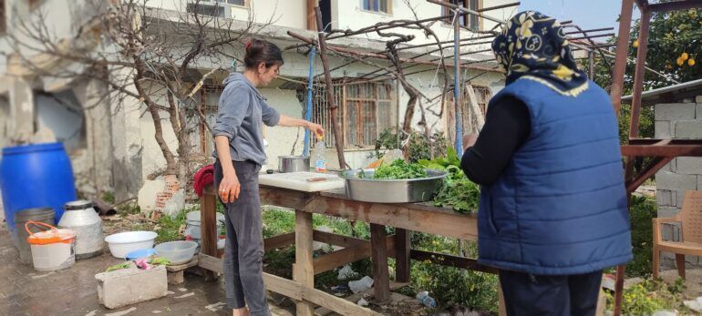 “Çok daha yorucu şimdi. Banyomu kullanamıyorum mesela çatı yok diye. Yağmur yağıyor, soğuk. Kızıma banyo yaptıramıyorum, ben bu evde hiçbir şekilde hareket edemiyorum. Su ısıtıyorum, içeri taşıyorum ama içerisi çok soğuk. Düşün, kış boyunca da böyle. Bahçelerde kesim varsa oralara gidiyorum üç dört gün. Haftada bir iki gün çağırırlardı. Benim durumumu bildikleri için acıyorlar, ‘Gel ne yapabilirsen’ diyorlardı. Gidiyordum. O yevmiyelerle idare ediyordum ama çocuklar nasıl idare etsinler? Şimdi depremden sonra yevmiye de kalmadı.
