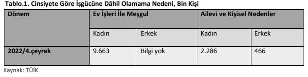 Toplumda kadınların göreviymiş gibi görülen ev işleri, temizlik, çocuk, yaşlı ve hasta bakımı gibi işler nedeniyle kadınların büyük kısmı çalışma yaşamına katılamıyor. 2022 yılı 4’üncü çeyrek verilerine göre 9 milyon 663 bin kadın, ev işleri nedeniyle çalışma hayatına dâhil olamadığını belirtirken erkeklerle ilgili böyle bir veri bulunmuyor.