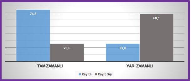 Ülkede tam zamanlı çalışan kadın sayısı 8,6 milyon, yarı zamanlı çalışan kadın sayısı ise 1,6 milyon. Tam zamanlı çalışan kadınların yüzde 25,6’sı, yarı zamanlı çalışan kadınların ise yüzde 68,1’i kayıtdışı çalıştırılıyor.