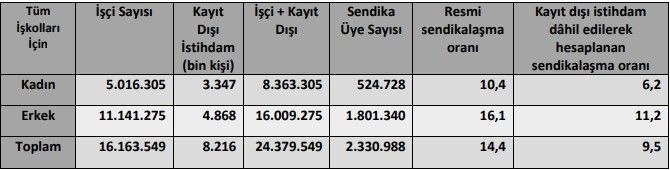 Kadınların sendikalara katılımı hâlâ düşük. Ocak 2023 verilerine göre, Türkiye’de kadınların sendikalaşma oranı yüzde 10,4 iken erkeklerde bu oran yüzde 16,1. Bu veriye kayıtdışı istihdam dahil edildiğinde, gerçek sendikalaşma oranı kadınlarda yüzde 6,2’ye, erkeklerde ise yüzde 11,2’ye geriliyor.