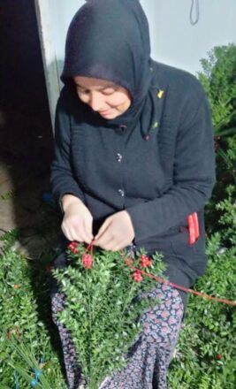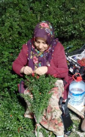 İşçilerin en eskisi 42 yaşındaki Nagihan Kurcan. Fındık işçiliği yaparken bu yerel bitkileri işleyen bir aileyle tanıştı ve işi öğrendi. Tam bu dönem, senenin bitimine iki-üç ay kala yağmur, çamur demeden ormana gitmek zorunda olduklarını söylüyor ve şunları aktarıyor; “Bu çiçekleri el emeğiyle özel olarak bir buket haline getiriyoruz. Dikenleri bizim buradan, Kaynarca ormanlarından kesiyoruz. Kırmızı çiçeklerini ise başka bir bölgede yetiştiği için orada toplama yapan bizim gibi işçi kadınlardan alıyoruz. İşimiz dikenli dalları ve çiçekleri birleştirmek”. Sadece kasım ve aralık aylarında çalışıyorlarmış. Yılbaşı ritüeli olarak o kadar revaçta ki bu yeşilli kırmızılı süsler. “Şans getirdiğine” dair bir inanış da var. Nagihan, çok sayıda kadın için bu çiçeklerin bir ekmek kapısı haline geldiği bilgisini aktarıyor.