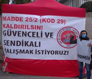 “İşe iademizin ardından çalışmaya başladık. Ben TOMİS’in Simbo baş temsilcisi olarak her sabah iş başı yapmadan önce işçileri sendikalı olmaya çağırıyordum. İşçileri iş kazalarına karşı uyarıyor, diğer hak kayıplarıyla alakalı bilgilendirmelerde bulunuyordum. Mesai başladığında ise işimin başındaydım ve düzgün çalışıyordum. Ancak işçileri sendikaya davet ettiğim için Kod 29 ile çıkışım verildi. Bu haksızlık karşısında ben ve sendikam 233 gündür Sinbo fabrikası karşısında kurduğumuz çadırda direniyor, işe iademi istiyorum. Diğer beş arkadaşım fabrikada işbaşı yapıyorlar ama söylediklerine göre yıldırma politikası sürüyor ve sendikadan istifa etmeleri için baskı görüyorlar” diye konuşuyor.
