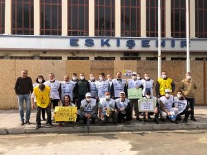 BTS İzmir’de üye potansiyeli arttı. Bu büyümeyi hazmedemediler esasında. Rövanş almak istediler. Önce Nurhan Karadağın eşi arkadaşımız Ünal Karadağı Malatya’ya sürdüler. Esasında yasa gereği sendika yürütme kurulunda bulunan sendika iş yeri temsilcileri kendi istekleri dışında farklı yerlerde görevlendirilemezler. Ama yasayı bay pas ederek hukuku tanımayarak Nurhan arkadaşımızın eşini sürgün ettiler. Daha sonra bunu geçici görevlendirmeye çevirdiler. Geçici göndermenin süresinin dolmasına yakın bu sefer 12 arkadaşımızla birlikte naklini çıkardılar. Hukuki süreç başlattık, bir yandan da oturma eylemleri yaptık, Ankara’ya yürüdük ve mahkemeleri kazandık. Bu arkadaşlar teker teker geri döndüler. Geri döndükten sonra Ünal Beyi tekrar sürdüler, geri geldi, tekrar sürdüler. Eş durumdan dolayı gelmişti. Bu kez Nurhan Karadağı da Malatya’ya sürdüler. İzmir’de kalırsa işyerinde huzursuzluk çıkarma ihtimali var, şeklinde bir gerekçe ileri sürdüler. Sosyal medya üzerinden eylemler örgütledik, her hafta aynı günde iş çıkış saatinde oturma eylemi yaptık.