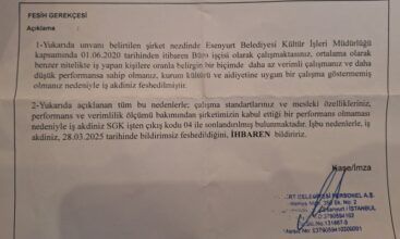 “15.12.2021 tarihinde güvenlik görevlisi olarak Esenyurt belediyesinde işe başladım. Çalışma sürecinde verilen her görevi eksiksiz yerine getirdim. İşimle alakalı bir tane tutanağım, disiplin kurulu veya sözlü ihtarım dahi yok. 14.03.2025 tarihinde mesai saatim içerisinde çağrıldım ve 04 kodundan işveren tarafından işim fesh edildi” diye anlatıyor.