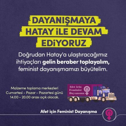 Depremzede kadınlar, LGBTİ+’lar ve çocuklarla dayanışmak için geçtiğimiz günlerde İstanbul’dan Adıyaman’a Mor Tır gönderen Afet için Feminist Dayanışma Grubu, şimdi de Hatay için malzeme toplanacağını duyurdu.