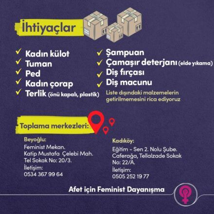 Gruptan yapılan çağrıda, malzeme toplama merkezlerinin cumartesi, pazar ve pazartesi günleri, 14.00-20.00 saatleri arasında açık olacağı belirtildi. Bu merkezler, Beyoğlu’ndaki Feminist Mekân ve Kadıköy’deki Eğitim Sen 2 No’lu Şube olarak belirlendi.