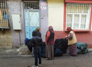 Parça başı işin niteliğine göre en az 15 kuruş en fazla 1 TL’ye çalışıyor kadınlar ve günlük en az 12 saat, gün aşırı bu işi yapıyorlar. Yani günün yarısını alıyor bu iş. Günlük yapabildikleri limit ise 15 ya da 20 parçayı aşmıyor. Zira ev işleri ve çocuk bakımı da bir yandan kadınları bekliyor. Günlük kazandıkları ücret maksimum 20 TL’yi geçmiyor. Tabi ellerindeki tüm işi bitirebilirlerse. Ayrıca bu iş bir yandan da evi kirletiyor (özellikle kazak sırıçlama, fıstık/ceviz kırma ve tekstil ürünleri üzerindeki atıl ipleri temizleme), ardından da bu işin temizliğine sıra geliyor. Çocukları ve akrabaları da yardımcı oluyor kendilerine. Akraba desteği ise daha çok sosyal dayanışma anlamında gerçekleşiyor. En basit haliyle aktaracak olursam birlikte bu işi yaparken muhabbet edip işle geçen sıkıntılı süreyi daha rahat atlatıyorlar. Evet, Suriyeli göçmen kadınlar kapı önünde bu işi yapmıyor. İki grup arasında açığa çıkan sosyo-kültürel bir farklılık meselesi bu. Suriyeli kadınlar sokağın erkeğe ait olduğunu dile getiriyorlar. Bunun örf ve adetlerine uymadığını ifade ediyorlar. Daha önce Halep’te de bu işi yaptıklarını söyleyen kadınlar hep ev sınırları içerisinde çalışmışlar. Hatta Gaziantep’te kadınların yaygın bir alışkanlığı olan kapı önünde oturmayı da eleştirip ayıplıyorlar. Bu ilk ve en güçlü sebep. Daha cılız bir sebep olan ikincisi ise sosyal dışlanmayla yoğun bir biçimde karşılaşan Suriyeli kadınlar görünmezliği tercih ediyorlar. Bu işi yaptıklarını gören yerli kadınların olumsuz söylemleriyle de karşılaşmak istemiyorlar.