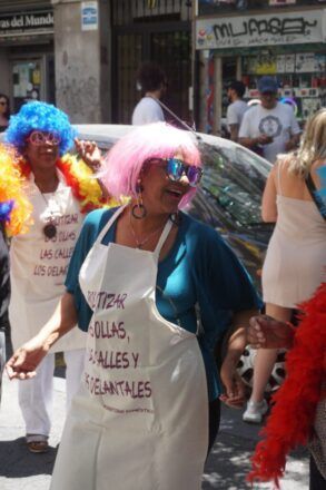 İnşa ettiğimiz başka bir araca “podyum” diyoruz. Mankenlerin üzerinde yürüdüğü gibi bir podyum. Ev işçilerinin, kadınların hayatlarını gösteriyoruz. Karakterler oluşturuyoruz ve sonra onları caddede gezdiriyoruz. Hem sokaklarda hem de iç mekânlarda kullanılabilen bir araç bu. Giyiniyoruz, peruk ve gözlük takıyoruz, kostümler giyiyoruz. Bunu ayrıca, özellikle İspanya’da belgesizlere yönelik polis tacizi ve baskınlarından kendimizi koruyabilmek için yaptık. Podyum, pek çok ev işçisinin sokakta kendini ifade etmesine olanak sağlayan alternatiflerden biriydi, çünkü kostümler giyerdik ve kimse kim olduğumuzu bilemezdi.
