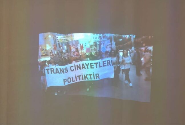 Trans Hafıza Kolektifi tarafından bir araya getirilen trans hareketinin eylemlerinden oluşan videodaki sloganlar, ıslıklar, çığlıklar, düdük sesleri sergi boyunca ziyaretçilere eşlik ediyor: Trans cinayetleri politiktir, nefrete inat yaşasın hayat, ay ay ayy ayyyy…