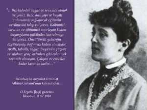 Tıpkı diğer haklar gibi kadınların ücret eşitliği hak talebi Osmanlıdan Cumhuriyete dek sürecektir. Sosyalist bir kadın olan, kadınların özgürleşmesini ve toplum içerisinde daha etkin olmasını savunan Athina Gaitanu 1900’lerin başında gazeteye yazdığı bir makalede şöyle yazar. “Bugünün güçsüz ve silahsız genç kızları gibi evlenmek zorunda olmayan. Çalışan ve erkekler kadar kazanan kadın.”**