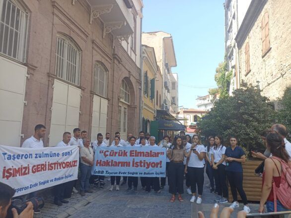İzmir Büyükşehir Belediyesi’ne bağlı taşeron firma Ozan Grup’a bağlı olarak evde sağlık ve bakım hizmetleri sunan ve 21 Temmuz günü Whatsapp mesajı ile işten çıkarılan 30 işçi, belediye önünde direnişlerini sürdürüyor. İşçiler işe geri alınmayı, güvenceli koşullarda çalışmayı ve taşeron işçiliğin kaldırılmasını istiyor.