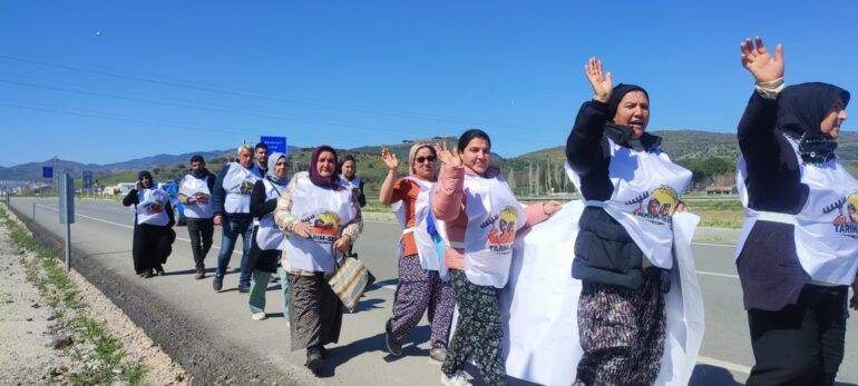 Açıklamalar ve konuşmaların ardından yürüyecek olanlar alkış ve sloganlarla uğurlandı. Halihazırda direnişte olan 15 kadından sağlık sorunları yürüyüşe elverişli olan Agrobay işçisi yedi kadının öncülüğünde başlayan yürüyüş, Soma’ya doğru ilerliyor.