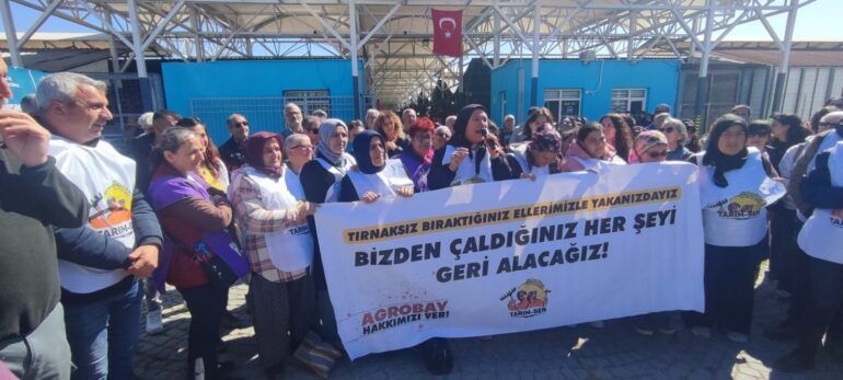 “Bu kadınların yaptığı tek şey, sendikalı olmak. Tüm Bergama halkı duysun, bu kadınların tek suçu, sendikalı olmak. Anayasada yazan bir hakkı kullanmak, bu kadınların başına gelen şeyin sebebi. Böyle bir yasa varsa, uygulayacaksın. Arzu Şentürk de olsa uygulayacak, Agrobay da olsa uygulayacak, Bayburt Holding de olsa uygulayacak. Ha birileri diyorsa; paran yoksa yasa bende, paran yoksa polis-jandarma bende… Bunu bilelim, o zaman çıkıp açık açık bu ülkeyi zenginler yönetiyor, desinler.”