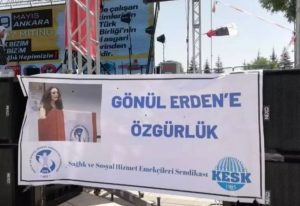 Tutuklu bulunan Sağlık ve Sosyal Hizmet Emekçileri Sendikası (SES) eski Eş Genel Başkanı Gönül Erden’in serbest bırakılmasına yönelik ‘Gönül Erden serbest bırakılsın’ pankartı alanda yerini alırken, sloganlarla da buna destek verildi.