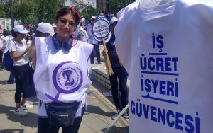 Alanda iki çocuğunu halaya sokan bir anneye nereden geldiğini sordum, çünkü mitinge çağrı için hastaneyi dolaşırken en sık rastladığım cümleler; iki çocuğumla nereye gideyim, kızımın kursu var, kim götürecek, çok isterdim, elinize emeğinize sağlık ama çocuk var, cümleleriydi. Arkadaşımız Ankara’dan katıldığını söyledi. Mitingde hem çocukları ile ilgilenmeye çalışıyor hem de kendini katmaya çalışıyordu. Tabii ki ona tanımadığı pek çok kadın destek verdi, halaya giren çocuklar ise yüz gülümsetiyordu. Aslında sağlık emekçilerine insanca yaşayacak temel ücret, insanca çalışma koşulları, derken, kadınların üzerine yapışmış rollerden kendilerini sıyıracakları bir yaşamı da kast ediyoruz. Esasında miting alanları da kadınların kendilerini ve taleplerini var edebilecekleri yerler.