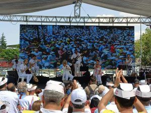 Son olarak Kardeş Türküler’e değinmeden geçemeyeceğim. Beyazları ve duruşları ile mitinge çok yakıştılar. Feryal Öney ve Fehime Çelik şarkıları uygun bulunmayan, ahlaksız (!) denilerek konserleri iptal edilen, kıyafetine laf edilen birçok kadın sanatçıya selam yollayarak Aynur Doğan’ın ‘Keçe Kurdan’ parçasını seslendirdi. Sağlık emekçileri koskoca bir halaya durdu, yerinde dans etti. Konser bitmişti ama yetmez dediler ve burçak tarlası türküsü ile bütün kadınlara selam yolladılar. Bizden rahatsız oluyorlar biliyoruz ama değişen, güçlenen kadınlar olarak daha çok rahatsızlık vermeye devam edeceğiz…