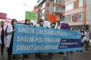 Geçen ay Avrupa Birliği bulaş riski olan alanlarda Covid’in meslek hastalığı sayılması yönünde, bir karar alınmıştı. Bizler bunu iki yılı aşkın süredir söylüyorduk. Sağlık bakanlığı duymamıştı sesimizi. Sağlık çalışanı kadınların kendi taleplerini içeren döviz ve pankartlarla alanda daha bir görünür olduklarını belirtmiştik. Üzerinde durulan konulardan biri de şiddetti. Artık olay mahalline dönen iş yerlerine vurgu yaparak, son dönemlerde erkek şiddeti ile yaşamını yitiren kadın arkadaşlarımızı da andık.