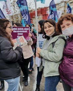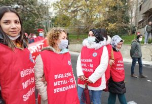 Aycan: Çalışıyoruz ama yetişemiyoruz. Kiralar 3 bin lirayı geçiyor, geçinemiyoruz. Çoluk çocuk hiçbir şeye yetişemiyoruz. İş yok, iş bulamıyoruz, iş bulamayınca erkeklere daha fazla muhtaç kalıyoruz. Erkekler de bizi öldürüyor. Kadınların yaşaması özgür olması için buradayım. Esasında Birleşik Metal Sendikası’nda kadın hakları için çok şey yapılıyor. İş yerinde bir şikayetim yok ama ücretimiz az geliyor, onun için de bugün bu meydanda toplandık.