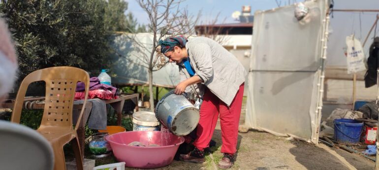 Yaşayamıyorlar, ağlayamıyor bile bazıları. Özellikle yalnız annelerde, çocukları için güçlü durmaya çalışan kadınlarda gördük bunu. Bir kadınla konuştuk, bize şöyle dedi: “Ben birkaç gün önce babamı defnettim, görebileceğim en kötü haliyle gördüm babamın cenazesini. Defnettim ve onun yasını tutmak yerine tuvaletimi nereye yapacağımı düşünmek zorundayım. Bu çok aptalca değil mi?” Yas sürecini doğru şekilde yaşayabilmeleri için temel haklara erişebilmeleri gerek. Ama tuvalet yok, su yok. Tuvaletlerini yaptıkları yerin iki adım ötesinde kendi çadırları var, kokudan durulmuyor.