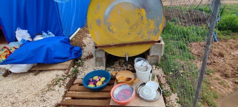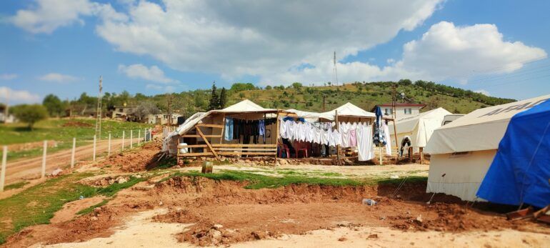 Çamaşır yıkanması için de aynı durum söz konusu. Saatlerce kuyrukta beklemek, kadınlar için hem yorucu oluyormuş hem de daha gergin hissediyorlarmış kendilerini. Bıkmışlar. Çamaşır yıkama işini de hasarlı binaları kullanarak halletmeye çalışıyorlar. Çadırına makine çıkartabilen yok denecek kadar az. Çadırlar birbirine çok yakın olduğu için halat yığınında boğulmuş bir çadır kentte halatlara ve kazıklara takılıp düşenler oluyormuş. Özellikle çamaşır asarken ve toplarken… Çocuklar da oyun oynarken… Yağmur yağdığında zeminin daha da kayganlaştığı bu alan, deprem öncesinde ekim yapılan bir tarım arazisiymiş. Yağmur çiselediğinde dahi koşan çocuklar düşüp kendilerini yaralıyorlar.