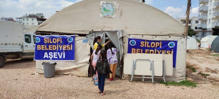 İlk günler çeşitli dernekler ve örgütlenmelerin de dayanışmada bulunduğu Pazarcık’ta şu anda Dersim Belediyesi, Sosyalist Meclisler Federasyonu (SMF), YSP, TKP ve Alevi dernekleri bulunuyor. Bizim gittiğimiz dönemde Silopi Belediyesi’nin kurmuş olduğu aşevi yemek dağıtımı yapıyordu. Aşevinin Ramazan Bayramı’ndan sonra gideceği duyurulmuştu. Pazarcık halkı gitmelerini istemiyordu. Çünkü sağlıklı, doyurucu ve lezzetli yemek yapan tek aşeviymiş. Kızılay’ın da yemek dağıtımını yaptığını söylediler. Ancak buradan yemek yiyenler genel olarak mide rahatsızlıkları yaşamaya başladığı için yalnızca ekmek alıyorlarmış artık.