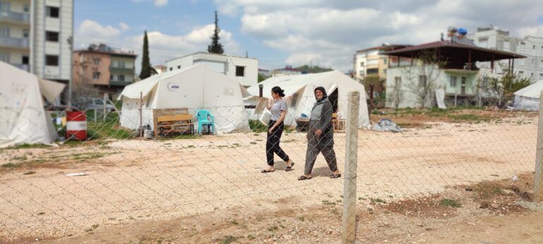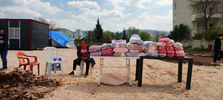 14 Mayıs seçimleri öncesi gittiğimizde Yeşil ve Sol Parti’nin seçim çadırına uğrayıp kadınlarla sohbet ettik. Bölgede yürüttükleri seçim çalışmalarının engellendiğini anlattılar. Çadırda bulunan depremzede kadınlar ise kendilerine yardım ulaştırılmadığını, devletin keskin bir şekilde mezhep ayrımcılığı yaptığını söylediler. Anlattıklarına göre yandaş Whatsapp grubu dahi oluşturulmuş. Kürt ve Alevi kökenli halk gece 23.00’e kadar yardım dağıtım noktalarında kuyruklarda bekletilirken Whatsapp’tan mesaj atılan insanların hızlıca kolilerini alıp çıktıklarını görmüşler. Kendilerine su bile verilmediğini söyleyen kadınlar oldu. Hijyen ve temizlik ürünlerinin, suyun çok büyük bir ihtiyaç olduğunu da dile getiren kadınlar, zaten ekonomik olarak çok zorlandıkları bir dönemde depremin yaşanmış olmasının daha büyük mağduriyetlere yol açtığını anlattılar.