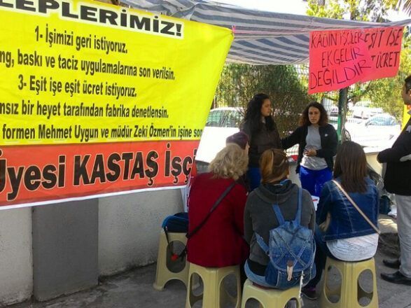 Biz o dönem Kastaş Komitesi olarak kadınları örgütlemek için yaşanan sorunları tartışıyorduk. Fabrikadaki cinsel tacizleri, haksızlıkları anlatan bir bildiri yazıp kadınların dolaplarına attık. Bunlardan hemen haberdar oldular ve tahammül edemediler. Kadınları taciz eden müdür işten çıkarılmamızın hemen öncesinde öfkeyle beni tutup bir makinenin üzerine fırlattı, işçi arkadaşlarımın tutması sayesinde yaralanmadım. Bunun üzerine müdüre bu yaptığının hesabını soracağımı söylediğimde panikledi, silahlı adamlar çağırdı fabrika önüne. Onların kurduğu onur kırıcı-aşağılık düzene boyun eğdiğin, onları zenginleştirdiğin sürece senden değerlisi yoktur. Ne zaman onların düzenine karşı geldik, o zaman her yol ve yöntemle karşımıza çıktılar. En sonunda da işten attılar. Biz çıkarılmamızı protesto edip eyleme geçtik. Fabrika önünde bir eylem çadırı kurduk, ona da müdahale edildi. Polis “Kaldırımı işgal ediyorsunuz” diye destekçilerimizle birlikte bize saldırdı. Gözaltına alındık, gözaltı arabasına bindirilirken tacizci ustabaşı karşımıza geçmiş kahkahalarla gülüyordu. Sonra öğrendik ki ertesi gün fabrika denetlenecekmiş ve Kastaş kapitalisti bizim orada görünmemizi istememiş.