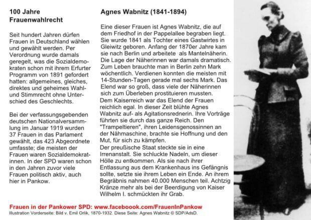 Agnes Wabnitz, Klara Zetkin ve Rosa Lüxemburg’un selefiydi. Alman Sosyal Demokrat hareketi içinde ölümünden sonra hemen unutulmasını iyi bir hatip olmasına rağmen yazılı eser bırakmamasına bağlayanlar var. Ama bu unutuluşun ardında yaşarken çokça tartıştığı erkek yoldaşlarının da bir miktar payı olmalı ….
