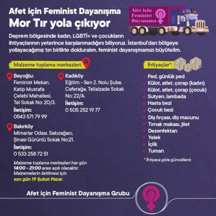 Kadın, LGBTİ+ ve çocuklar için İstanbul’dan deprem bölgesine Mor Tır göndermeye hazırlanan feministler, “Tırı birlikte dolduralım, feminist dayanışmamızı büyütelim” çağrısında bulunuyor.