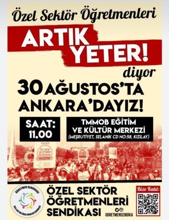 Özel-ücretli okullarda çalışan eğitim emekçileri Özel Sektör Öğretmenleri Sendikası’nın çağrısıyla bugün (30 Ağustos) Ankara’da buluşuyor. Öncelikle taban maaş hakkını yeniden kazanmak için yollara düşen öğretmenler, insani çalışma koşulları için de seslerini duyurmaya çalışıyor. TMMOB Eğitim ve Kültür Merkezi’nde saat 11.00’de bir araya gelecek olan öğretmenler, buluşmanın ardından Milli Eğitim Bakanlığı’na (MEB) yürüyecek.