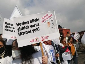 Alandakiler özetle bu düşünce ve hislerle greve katıldı ve herkes başka bir umutla ayrıldı o alandan. Kalabalıktı, enerji yüksekti, herkes omuz omuzaydı. Yürüyüş esnasında taşınan dövizler, atılan sloganlar alanda yaşanan sıkıntıları anlatıyordu. Dövizlerde ‘buradayız, hiçbir yere gitmiyoruz’ ’nöbet ertesi ücretli izin istiyoruz’ ‘şiddete, mobbinge, sömürüye son vereceğiz’ ‘artık yeter şiddet varsa hizmet yok!’ ‘teşekkür, alkış değil, hakkımız olanı istiyoruz’ ‘asistan hekim köle değildir’ ‘git-mi-yo-ruz’ ve ‘hastanede erkek şiddeti son bulacak’ gibi rengârenk dövizlerle grev alanı çok canlıydı. Cerrahpaşa’da yapılan yürüyüşün ardından her kurum kendi basın metnini okudu. Vazgeçmiyoruz, hakkımız olanı alacağız diyerek ilk günün kapanışı yapıldı.