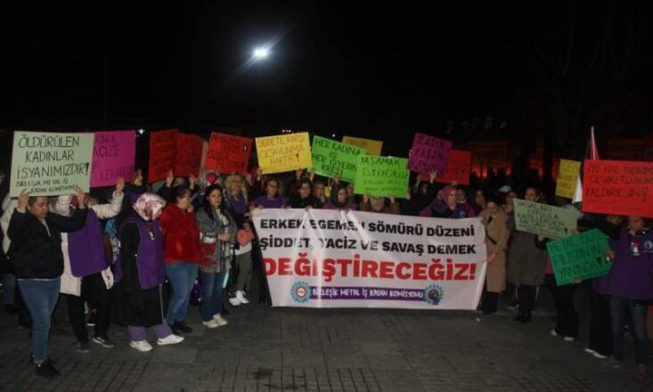 DİSK’e bağlı Birleşik Metal-İş Sendikası Kadın Komisyonu 24 Kasım akşamı Gebze Meydanı’na yürüyerek basın açıklaması yaptı. Oldukça kalabalık eylemde mor önlükler giyen kadın işçiler adına açıklamayı sendika üyesi işçilerden Zeynep Çam ve Gizem okudu. “Medyada her gün şiddet görüntüleri izlemekten, okumaktan, medyanın cinsiyetçi dilinden usandık. Bizler metal işçisi kadınlar, şiddete, cinsel tacize, kadın cinayetlerine, erkek egemen düzene ve eşitsizliğe karşı sesimizi yükseltiyoruz” diyen kadın işçiler, çalışma yaşamında şiddetin kaldırılması için taleplerini sıraladı:
