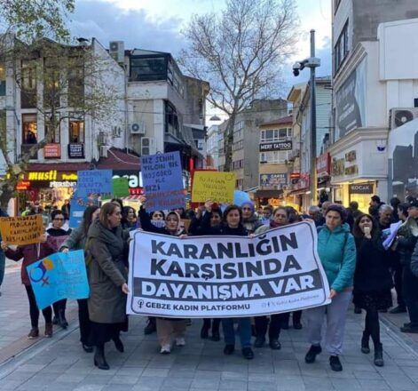Aynı gün akşam saatlerinde Gebze Trafo Meydanı’nda buluşan Gebze Kadın Platformu üyeleri Gebze Meydanı’na yürüdü. “Kimsenin namusu olmayacağız”, “Okullar bizimdir, imamlar dışarı”, “Nehirden Deniz’e özgür Filistin” dövizleriyle birlikte “Karanlığın karşısında dayanışma var”, “İsyandan direnişe, direnişten özgürlüğe” pankartları açan kadınlar sık sık “Yaşasın Kadın Dayanışması” sloganları atarak eylemi sonlandırdı.