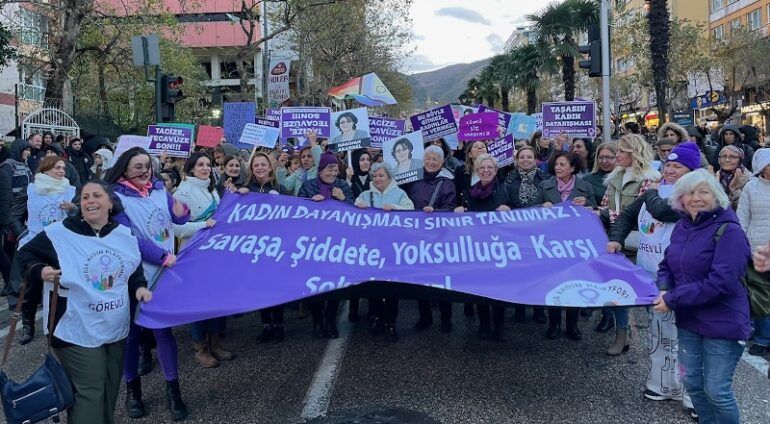 25 Kasım Kadına Yönelik Şiddetle Uluslararası Mücadele Günü’nde kadınlar Bursa’da “Kadın dayanışması sınır tanımaz” pankartıyla sokaklardaydı.