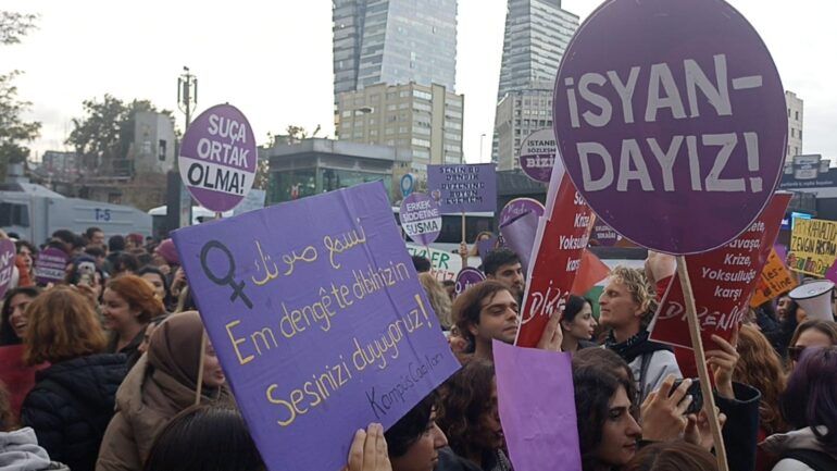 25 Kasım’da kadınlar erkek ve devlet şiddetini protesto etmek ve mücadeleyi birleştirmek için sokaklardaydı. Kadınlar eylemlerde “Filistin’deki soykırıma karşı İsrail’le ticarete son” çağrısı da yaptılar. 25 Kasım sendikaların da gündemindeydi.