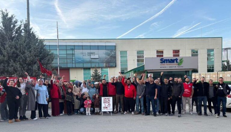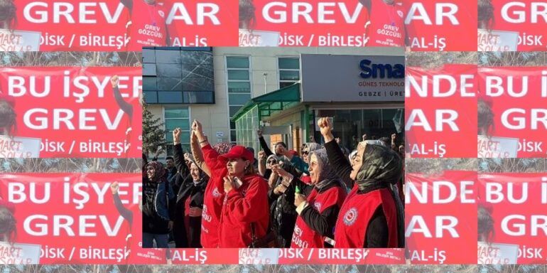 Gebze’deki Smart Solar Fabrikası’nda işçiler, patronun yüzde 6 oranında zam dayatmasına ve gasp edilen haklarına karşı 22 Ekim’de greve çıktı. Tüm kazanılmış haklarının gasp edilen, çoğunluğunu kadınların oluşturduğu işçiler, insanca bir ücret talep ediyor ve ekliyor: “İşverenler bize teklif ettikleri maaşlarla bir ay yaşamayı denesin”
