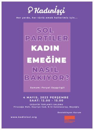 Türkiye’de kadın emeği, sol partilerin ne kadar gündeminde? Kadınların emek piyasasındaki ikincil konumu, kadın işçi sağlığı ve iş güvenliği, cinsiyete dayalı ücret ayrımcılığı, işyerinde şiddet ve taciz, cinsiyetçi iş bölümü, kadın istihdamı, güvencesizlik gibi sorunlarımızın çözümüne ilişkin ne söylüyorlar, ne yapıyorlar? Bu partilerin tüzük ve programlarında kadın emeğinin somut sorunlarının çözümüne ilişkin neler var, neler yok?