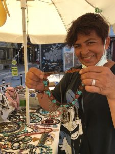 TEKEL’den emekli olduktan sonra bir tekstil firmasında birkaç yıl kalite kontrol elemanı olarak çalıştığını anlatan Yardımcı, daha sonra takı satışına yöneldiğini ve o gün bugündür takı üretip sattığını anlatıyor. Neredeyse hiç boş durmayan Yardımcı, 50 senedir dışarıda ve içeride aktif olarak çalışıyor… Pandemi süreci ve peşi sıra yaşanan kısıtlamalar ise belki de sadece onun için bir mola fırsatına dönüşmüş. Hayatında ilk defa kendine vakit ayırdığını anlatan Yardımcı, “Pandemi başlangıcında 18 ay çalışmadım. Büyük kızım evlenmişti, bebeği oldu. Kıyamıyorum ona. Yardımcı olmak için pandemi dönemi ona gittim. Yine burada tezgâhımı açmadığım üç gün, ona gidiyorum. Tabii kıza gitmeden önce yine erkenden kalkıp evin temizliğini, ütüleri, yemek işlerini falan hallediyorum. İşleri yetiştiremediğimde, önce kızımın yanına torun bakmaya gidiyorum akşama dönüşte, kalan işleri hallediyorum” şeklinde konuşuyor.