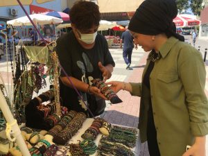 21 sene TEKEL’de işçi olarak çalıştığını belirten Yardımcı, “14-15 yaşında çalışmaya başladım ve 1993’te emekli oldum. Aynı yıl, üç kızımdan en büyüğü üniversiteyi kazandı. Takıyı çok severdi, satın alırdı. Ben de takı yapıyordum ama tekniği bilmiyordum. İSMEK’in takı kursuna yazıldım ve oradan tekniğini öğrendim. Evde kendimi geliştirdim. Bu sırada Kartal’ın bir önceki Belediye Başkanı Altınok Öz, dar gelirli kadınların ekonomiye kazandırılması ve girişimci yönlerini desteklemek maksadıyla, biz kadınlar için satış yapabileceğimiz yer temin etti. Başta ekoloji pazarının olduğu çarşının biraz dışında bir yerde tezgah açıyorduk. Sonradan şu anki Hamam Sokak’ta bizlere tahsis edilen bu boş alana taşındık ve burada tezgâh açmaya devam ediyoruz. Sabah erkenden gelip akşam 19.00’a kadar tezgâhımın başında olurum.”