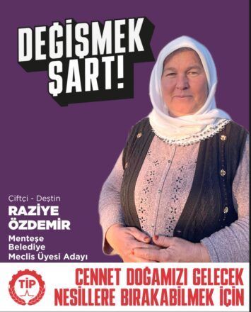Menteşe Belediyesi bütün köylülerin öfke duyduğu çimento şirketine “Olumlu ÇED Raporu” vermiş! (Geçen sene.) Deştin’e en büyük kötülüğü yapan bu insanlar üstelik… Seçimlerde belediyeye o nedenle asla oy yok. Bütün köylü bu görüşü taşıyormuş. Oyların kime gideceği de şimdiden belli. Diyor ki; “TİP’in Menteşe Belediye Başkan adayı bir kadın; Nazmiye Hanım. Oyumuzu ona vereceğiz. Bizi Belediye Meclis toplantısına almayan bir insanı niye yeniden seçelim ki?” Raziye Özdemir’in yerel seçim için hazırlanan afişinde şu slogan yer alıyor; “Cennet doğamızı gelecek nesillere bırakabilmek için”. “Cennet” olarak gördüğü o yeşil hazine adına savaşmaktan vazgeçmeye niyeti yok. Gurur dolu bir çehre görülüyor afişte yer alan fotoğrafında. Raziye, köylü kardeşlerini parti çatısı altında savunurken, o gururu hep taşıyan bir tarım işçisi. Başarmasını yürekten diliyoruz…
