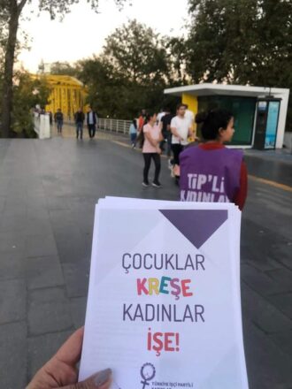 Son 15 yılda 374 kamu kreşi kapatıldı. 3-5 yaş grubunda üç milyona yakın çocuk bu hizmetten yararlanamıyor. 13 milyon kadın, çocuk baktığı için iş bile arayamıyor. “Özel kreşlere paramız yetmediği için çocuğumuzla eve kapanmak istemiyoruz” diyen TİP’li Kadınlar, “Çocuklar kreşe, kadınlar işe” sloganıyla kampanya başlattı.