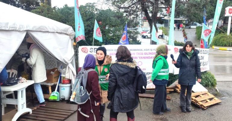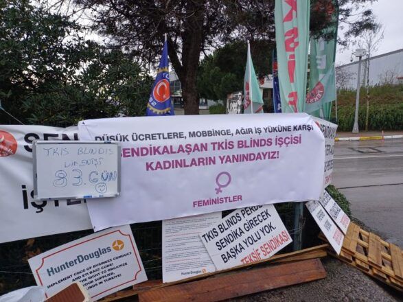 “Tuzla’da direnişte olan TKIS Blinds işçisi kadınlar düşük ücretlere, mobbinge, kötü çalışma koşullarına karşı direnişlerinin 83. Gününde. Sendikalı oldukları için işten atılan kadınlar başta İsrail olmak üzere yabancı sermayeye üretim yaptıkları iş yerinde ağır koşullarda asgari ücret düzeyinde ücretlerle çalıştırıldıklarını, hastalık için dahi izin almakta zorlandıklarını, ustabaşıların mobbingine maruz kaldıklarını anlattılar. Çoğunlukla kadın işçilerin çalıştığı fabrikada eşit işe eşit ücret verilmediğini, genellikle aynı pozisyondaki erkeklerin daha yüksek ücret aldığını da kadın işçilerle sohbetimizde öğrendik. Kadın işçiler için ayrıca işçi sağlığı ve iş güvenliği kriterleri oluşturulmadığını, yaralanmaların sık gerçekleştiğini konuştuk. Kadınların talepleri en başta sendikal haklarını kazanmak. Fabrikada örgütlenen TEKSİF Sendikası üyesi kadınlar koşulları sağlayarak yetki alan sendikalarının muhatap alınmasını, yetki itirazının geri çekilmesini, işveren ve sendika görüşmesinin sağlanmasını talep ediyor. Pek çok yerde kadın işçi direnişlerinin yükseldiğini, bu direnişlerin dayanışmayla kazanıma dönüştüğünü biliyoruz. Kadın işçilerin sesini duyuyoruz, bu sesi duyurmaya, birlikte mücadele etmeye devam edeceğiz.”