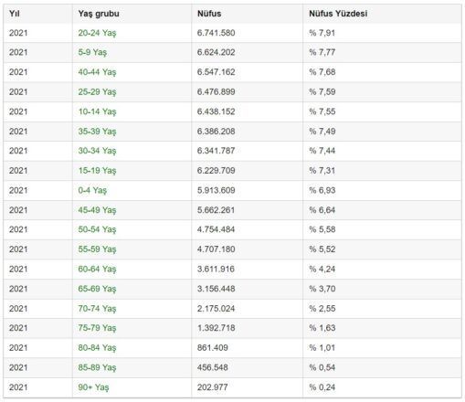 TÜİK’in verdiği bilgilere göre 2021 yılında Türkiye nüfusunun yaş gruplarına göre dağılımı ve nüfus yüzdesi şöyle: